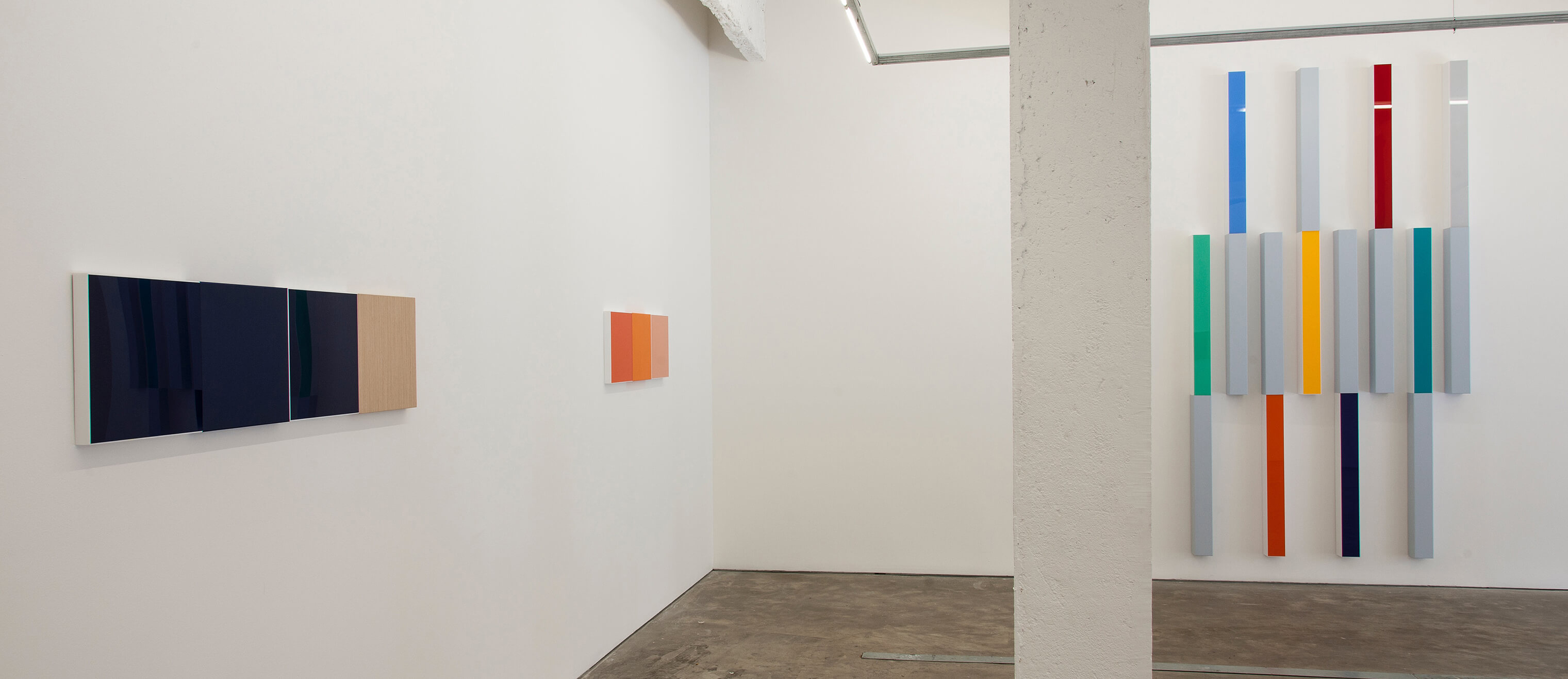 Olhando alguns trabalhos mais recentes, mais verticais, como os dois azuis diferentes separados por brancos, onde as áreas de cor têm tamanhos também diferentes, a unidade permanece. Sendo assim , a minha tese de que a unidade se dá por conta das cores estarem separadas em partes quadradas iguais, mesmo que levemente diferentes, não vale.